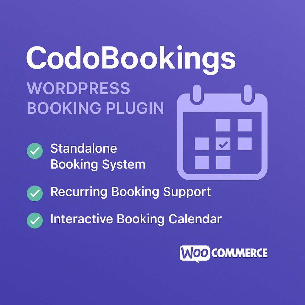 CodoBookings is a lightweight, practical, and fully standalone WordPress booking plugin. Originally built as a PMPro extension, it now allows you to manage appointments, schedules, and client interactions without relying on any third-party plugins. Future extensions will add optional integration with PMPro, WooCommerce, Google Calendar, and more.